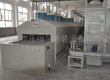 不粘鍋噴涂生產(chǎn)線,又名不粘鍋涂裝生產(chǎn)線、不粘鍋?zhàn)詣?dòng)涂裝線,全稱為不鉆鍋?zhàn)詣?dòng)涂裝生產(chǎn)線,其工作流程如下:手工上件、自動(dòng)吹塵、50℃預(yù)熱除潮、3S-4P無塵自動(dòng)噴涂(底涂)、130℃在線(底涂)燒結(jié)、急凍冷卻、3S-8P無塵兩次自動(dòng)噴涂(中層內(nèi)噴涂和頂層內(nèi)噴涂)、流平,手工下件進(jìn)28M-1200-450℃高溫?zé)Y(jié)爐(烘道)、3S-4P無塵自動(dòng)噴涂(外涂)、25M-1200-280℃中溫?zé)Y(jié)爐(烘道)、下件。